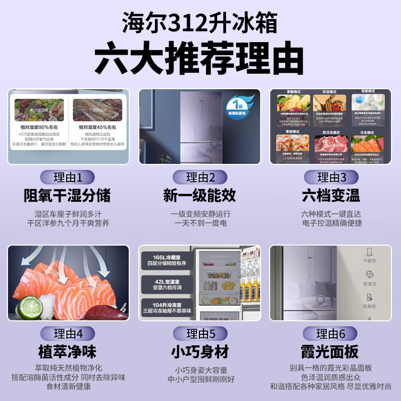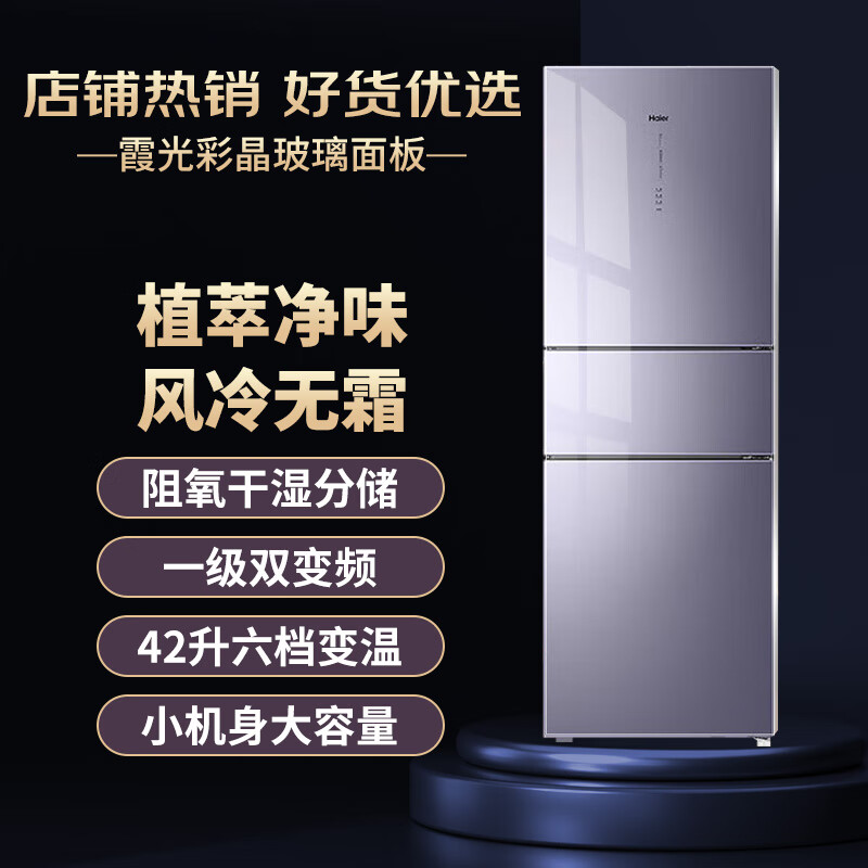 海尔(Haier)冰箱312升大三门变频风冷无霜冰箱 家用大容量干湿分储 一级能效彩晶玻璃 BCD-312WFCM 霞光紫价格:3299.00元!