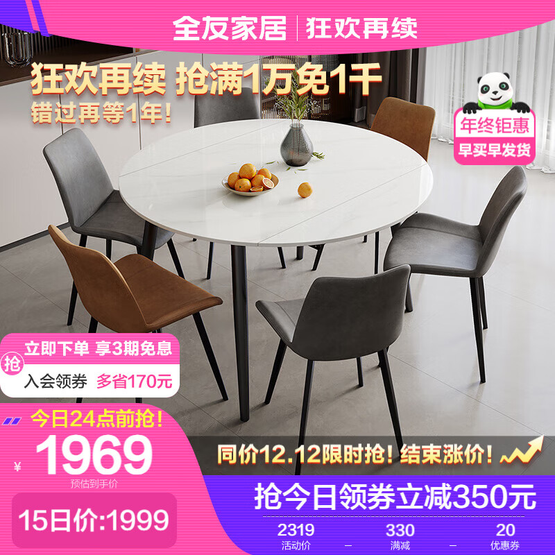 全友家居 家用意式极简可伸缩可方可圆客厅岩板餐桌椅组合126702价格:2319.00元!