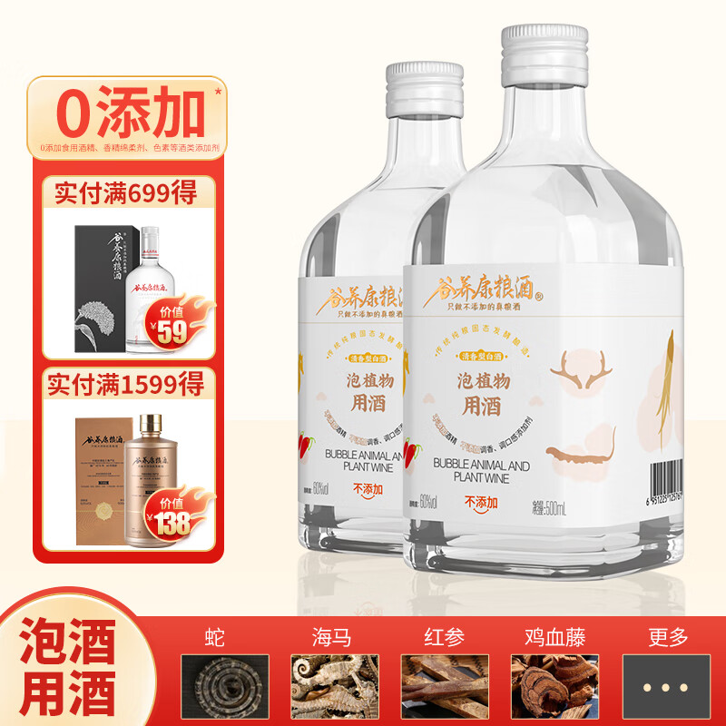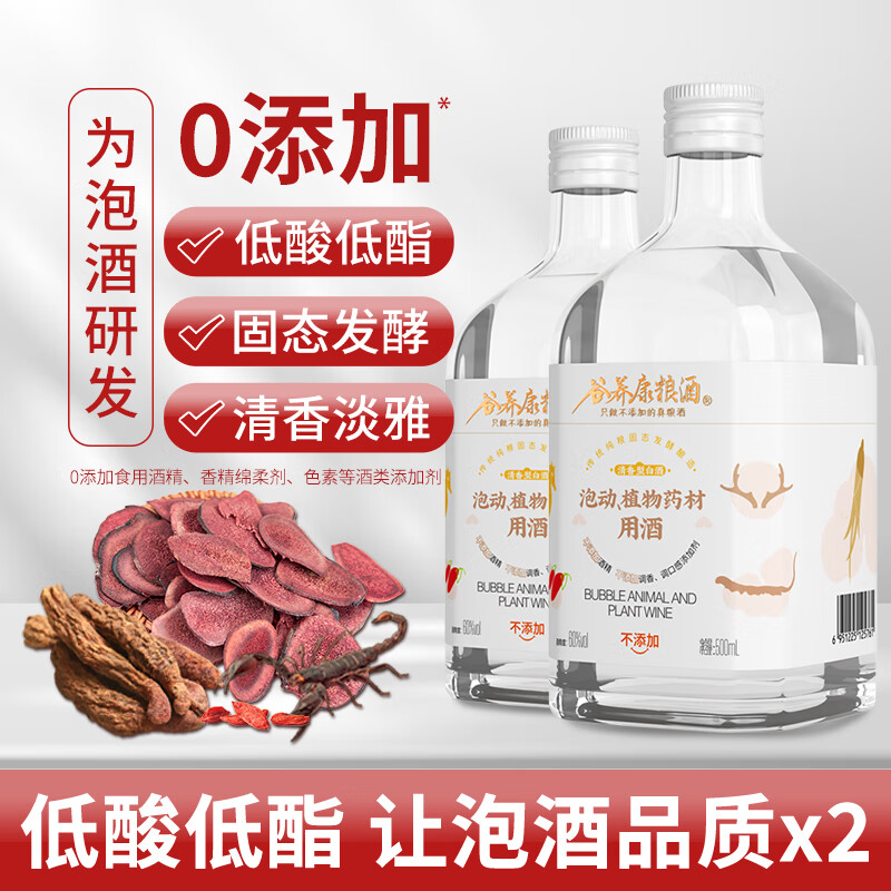 谷养康粮食酒 泡酒用酒瓶装清香高粱酒白酒泡果酒泡药酒纯粮酒 60度 500mL 2瓶 【适合动植物类】价格:93.00元!