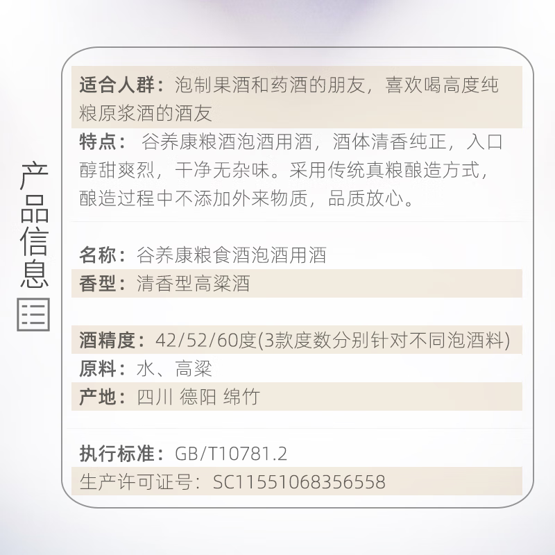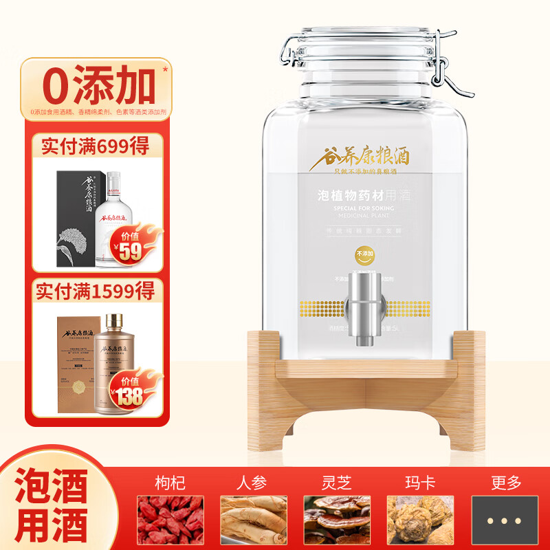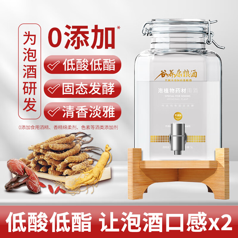 谷养康粮食酒 泡酒用酒大瓶清香高粱酒白酒泡果酒泡药酒水果酒纯粮酒 52度 5L 1瓶 【龙头款】价格:503.00元!