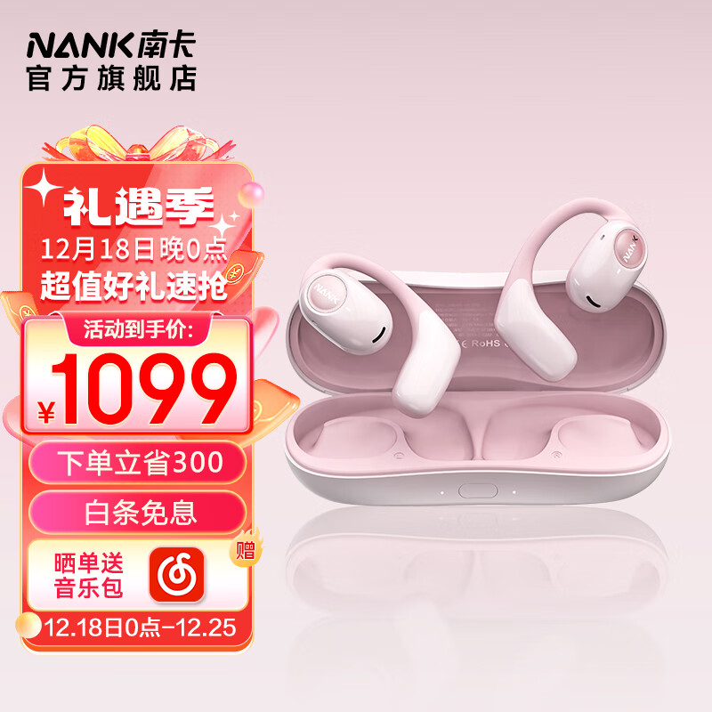南卡(NANK)00压运动蓝牙耳机不入耳开放式跑步耳机无线耳机挂耳式超长续航 OE PRO 璎珞粉价格:1259.00元!