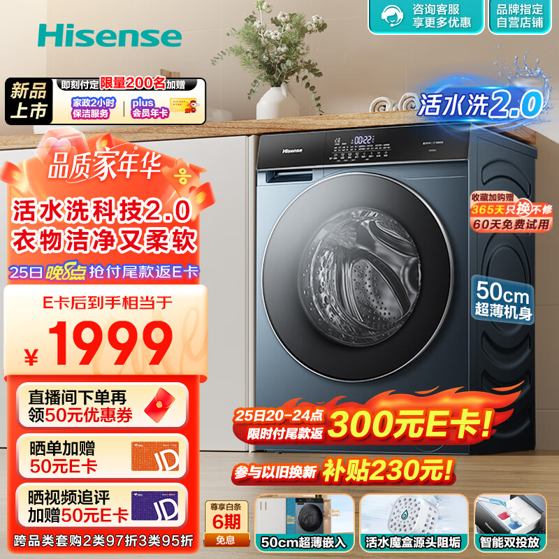 海信(Hisense)滚筒洗衣机全自动 10公斤洗烘一体 超薄智能双投放 活水洗2.0 HD10SE5 以旧换新价格:2299.00元!