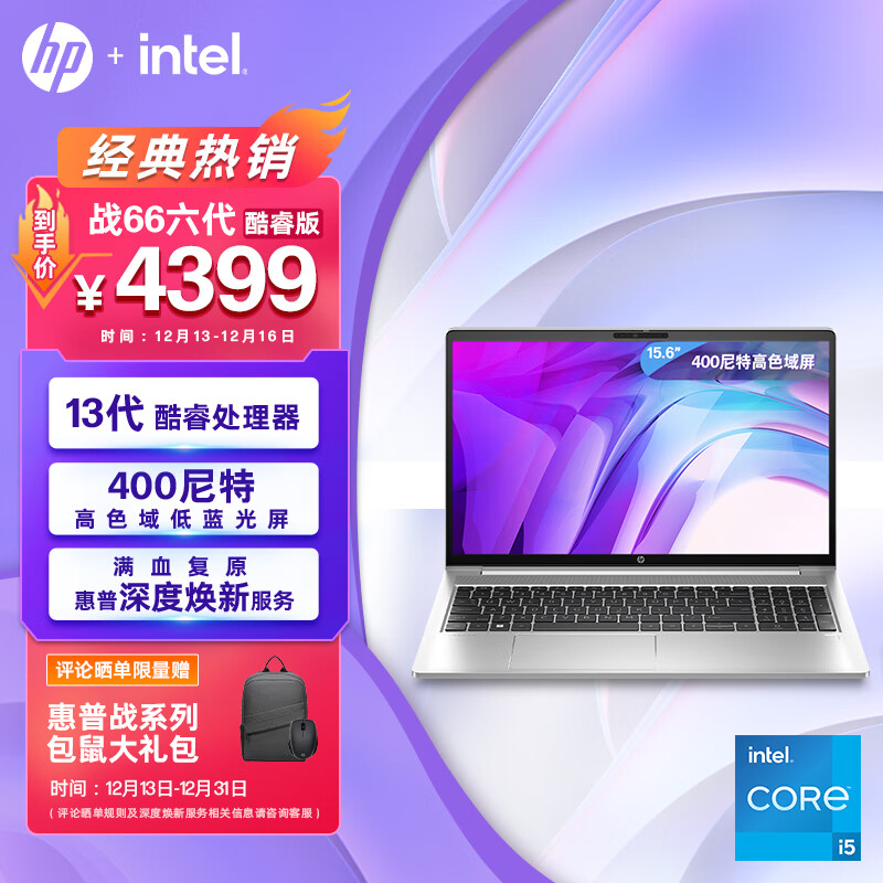 惠普(HP)战66六代2023酷睿15.6英寸轻薄笔记本电脑(英特尔13代i5-1340P 16G 1T 长续航 高色域低功耗 AI新体验高性能)价格:4399.00元!