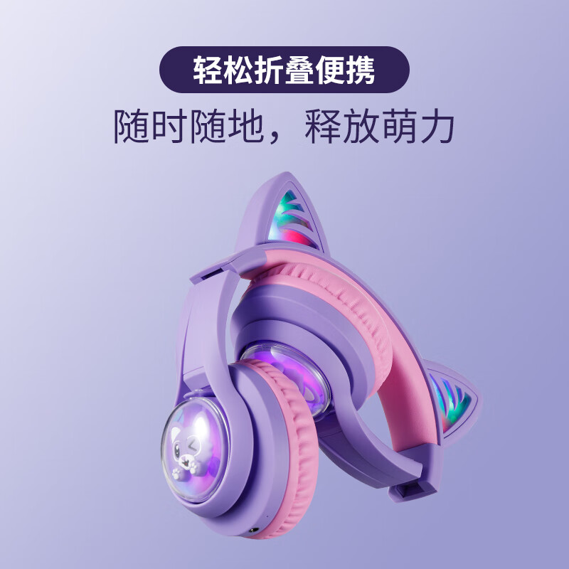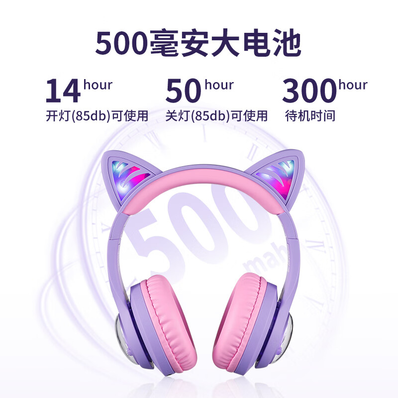 1、小朋友很喜欢这个耳机,很时尚,音质也非常棒,立体环绕声,还有重低音。开机炫酷的耳朵一闪一闪,非常棒的耳机,推荐购买。