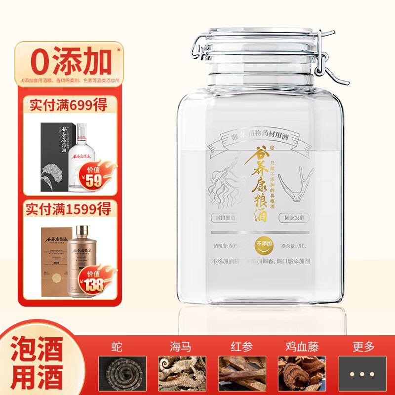 谷养康粮食酒 泡酒用酒大瓶清香高粱酒白酒泡果酒泡药酒水果酒纯粮酒 60度 5L 1瓶 适合动物类【质选】价格:1975.00元!