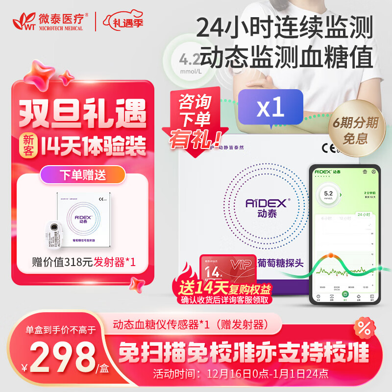 微泰动泰 动态血糖仪家用免采血24 小时动态血糖测试仪免扫描免校准(1 个传感器探头)价格:430.00元!