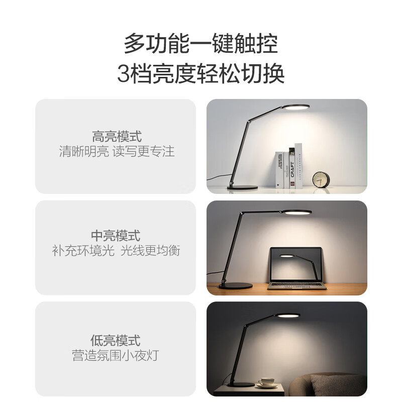5、灯光效果:三档调光,不刺眼,不酸眼睛,长时间使用也很舒适。外观款式:黑色非常沉稳大气,很顺眼。操作控制:操作简单,触控按键,非常灵敏。材质工艺:不锈钢,很大很稳很沉。