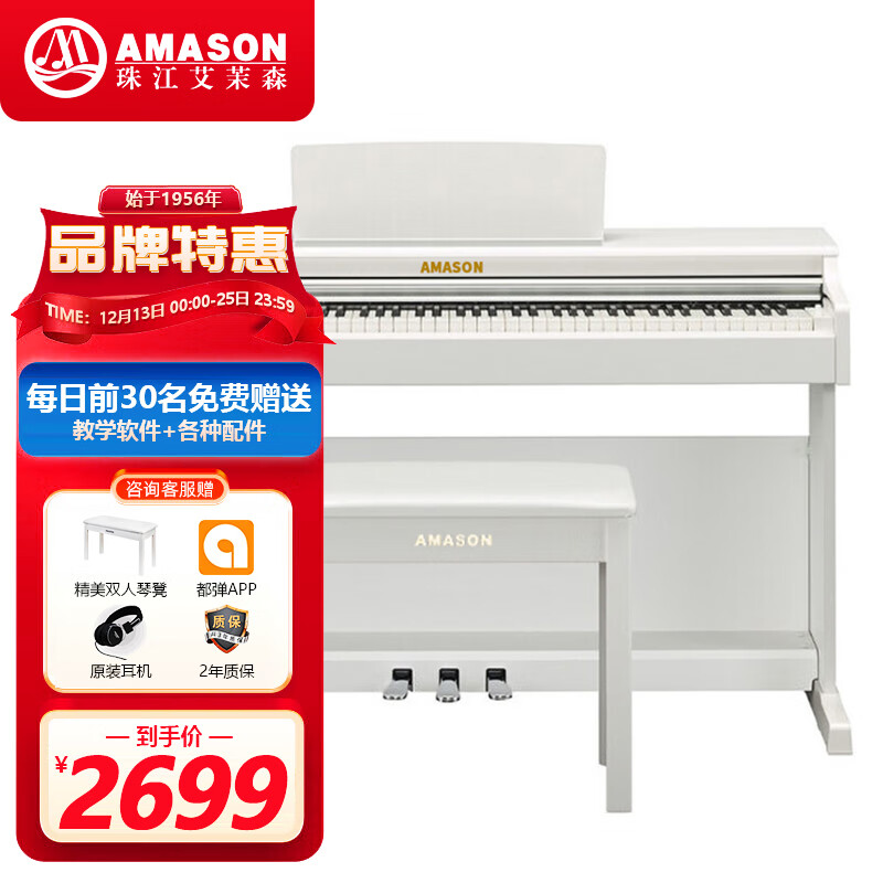 艾茉森(Amason)珠江钢琴 考级电钢琴88键重锤数码电子钢琴专业成人儿童V03S白色价格:3299.00元!