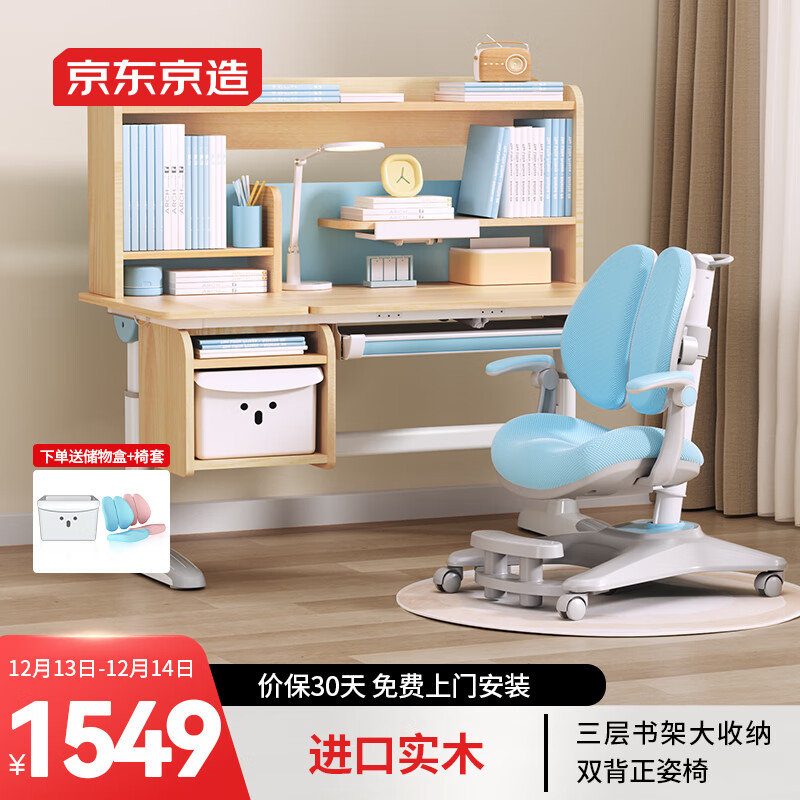 京东京造儿童书桌学习桌椅写字桌【进口实木 三层书架 可升降】1.12m蓝价格:1649.00元!