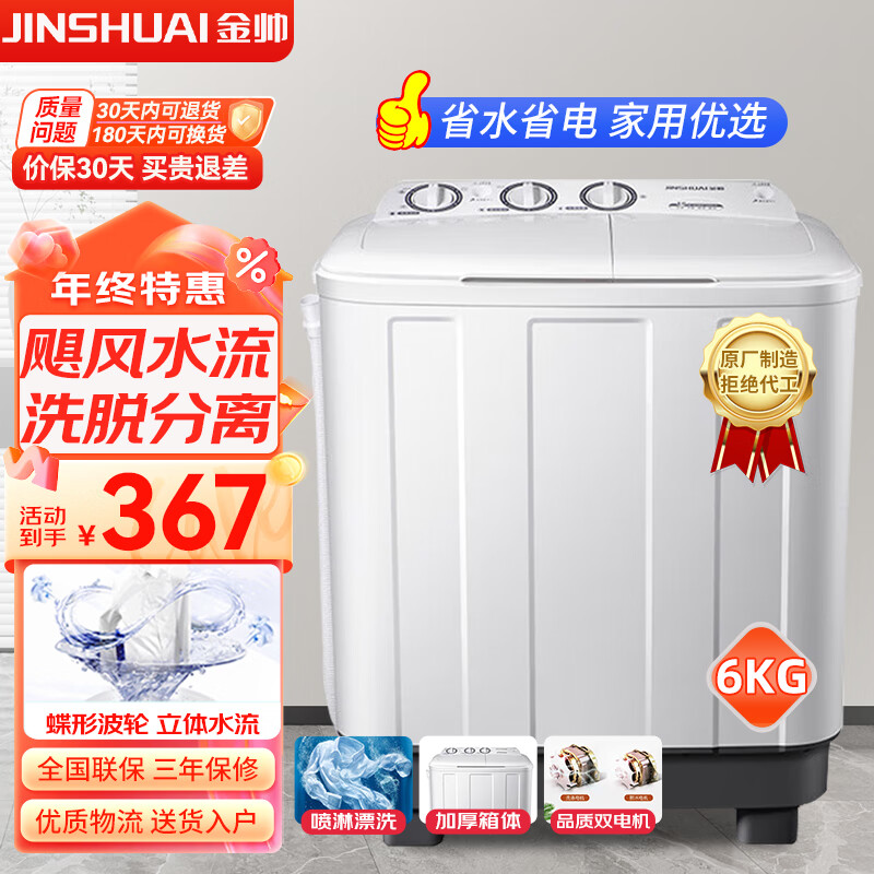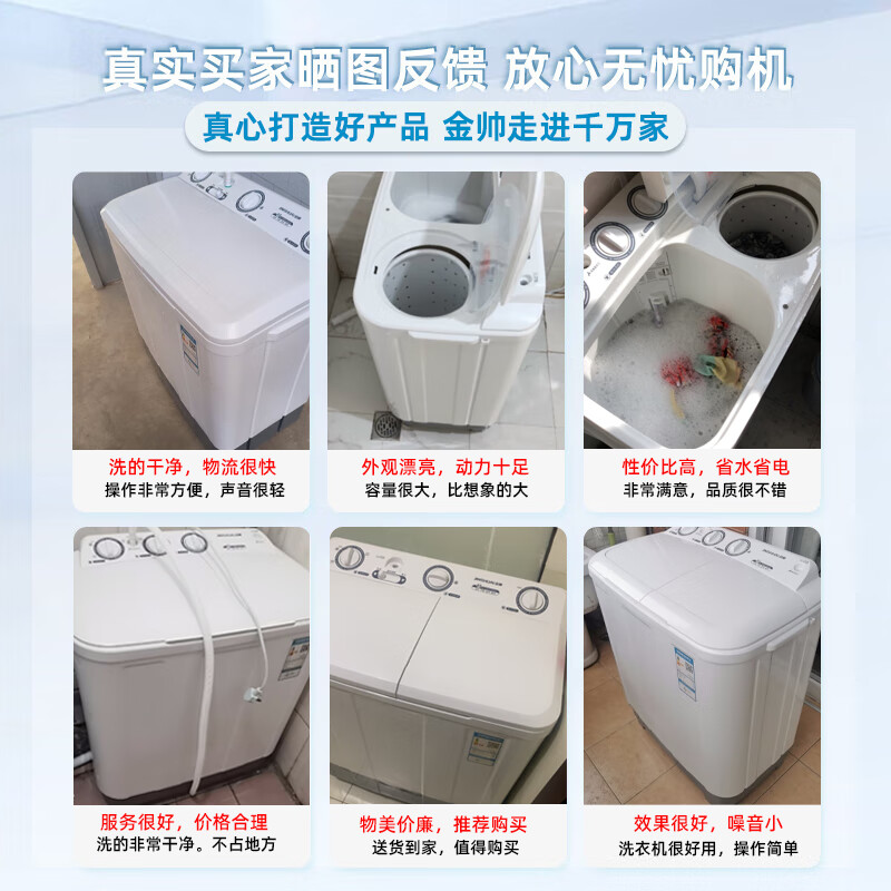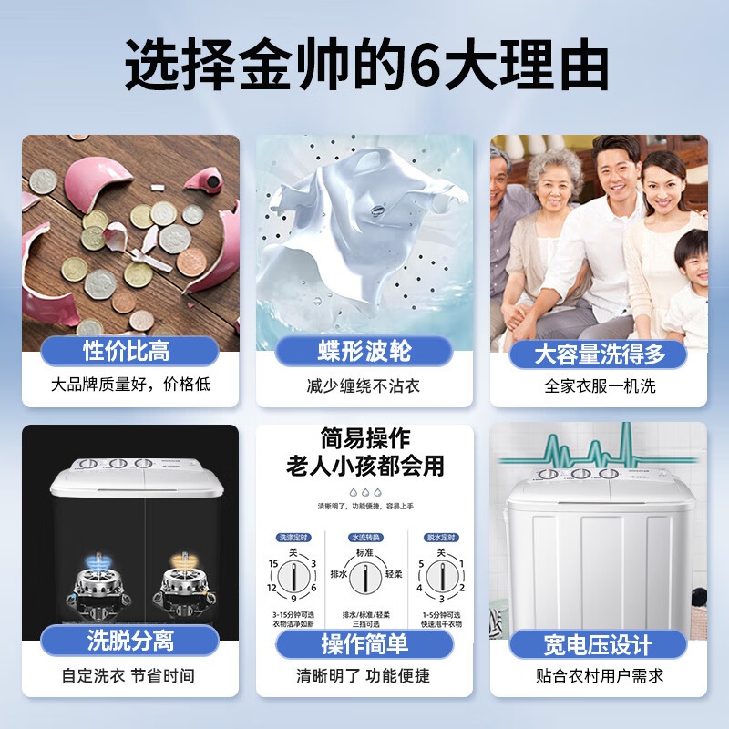 金帅6公斤大容量半自动洗衣机双桶双电机家用波轮脱水一键甩干洗脱两用老人会用XPB60-2668JS价格:367.00元!