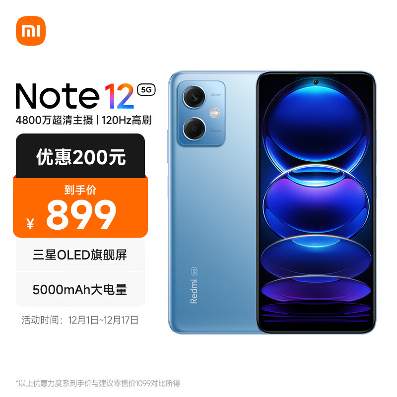 Redmi Note12 5G 120Hz OLED屏幕 骁龙4移动平台 5000mAh长续航 6GB+128GB时光蓝 智能手机 小米红米价格:899.00元!