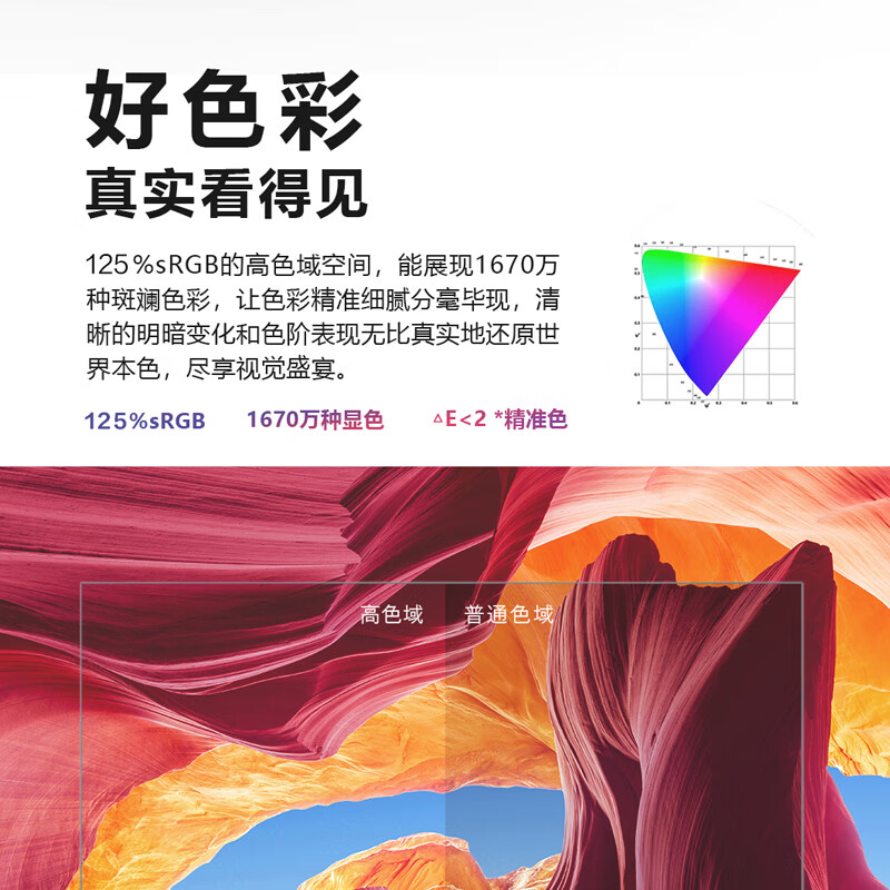 5、外形外观:外观简约,银白色,底座占用空间小,很适合桌面不大的场景。刷新率:刷新率75HZ已经能够满足日常大部分场景了。显色效果:色彩也很绚烂。尺寸大小:尺寸大小刚刚好,看着也很舒服。