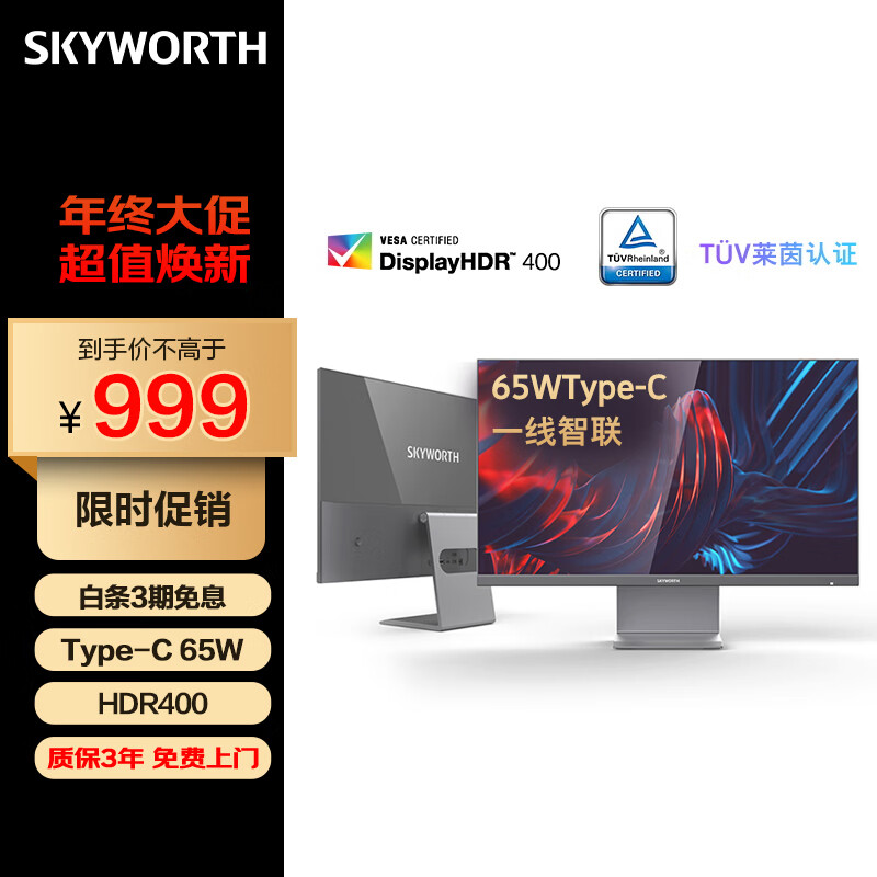 创维(Skyworth)23.8英寸 办公显示器 2K 75HZ IPS HDR400 65W Type-C 玻璃背板电脑显示屏 智能光感F24B40Q价格:1099.00元!