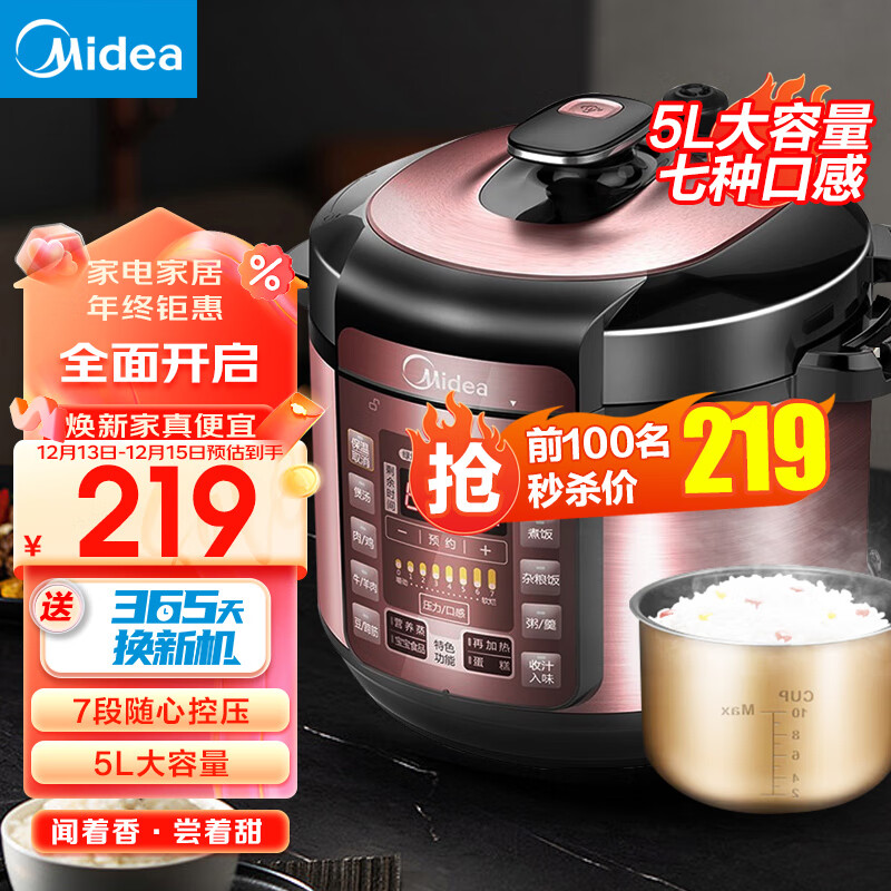 美的(Midea) 电锅 高压锅 电高压锅家用大容量多功能定时预约高压电饭煲电饭锅 【5L 单胆】(4-10人)价格:299.00元!
