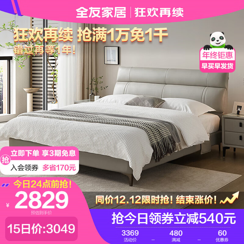 全友家居 进口头层牛皮皮床意式极简1.5米双人床卧室家具105251A价格:3369.00元!