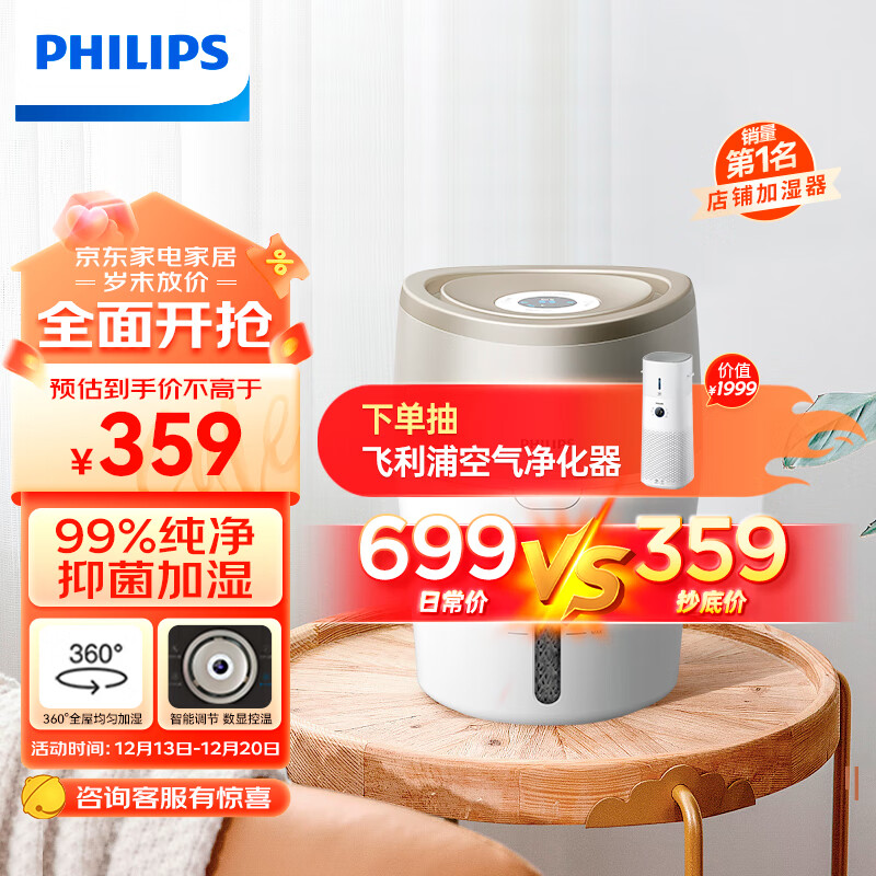 飞利浦 (PHILIPS)无雾加湿器 卧室低噪款 恒湿数显加湿器 母婴健康无菌 卧室客厅多用 HU4803/00价格:359.00元!
