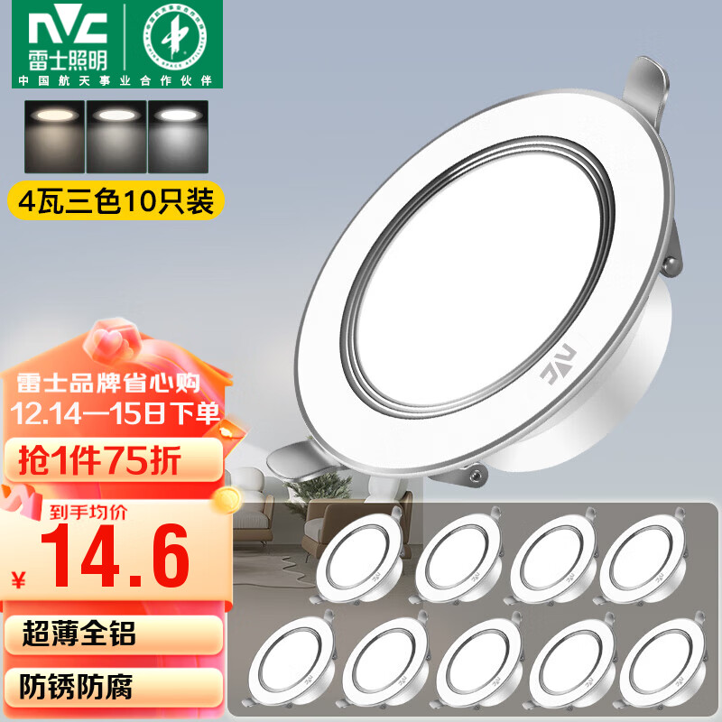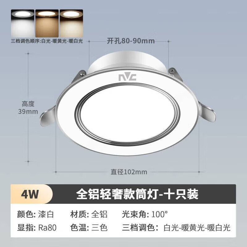 雷士(NVC) LED筒灯客厅吊顶天花灯嵌入式孔灯4瓦三色开孔8-9cm漆白10只装价格:190.60元!