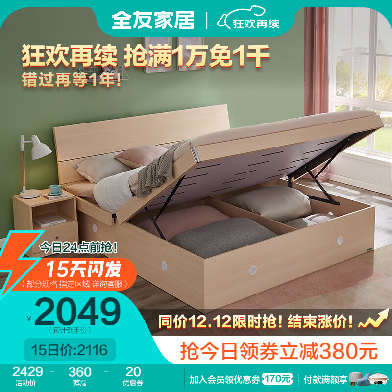 全友家居 床现代简约木纹双人床可储物主卧室成套家具高箱床106302价格:2429.00元!