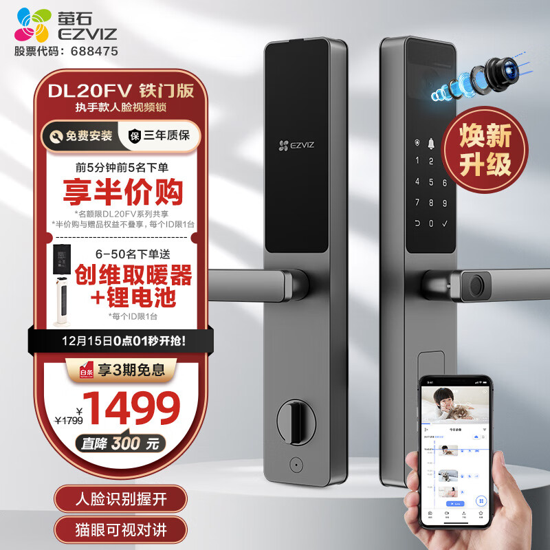 萤石DL20FV智能人脸视频锁 铁门版标准锁 3D人脸识别指纹握开式视频锁 家用全自动智能猫眼门铃防盗电子门锁价格:1599.00元!