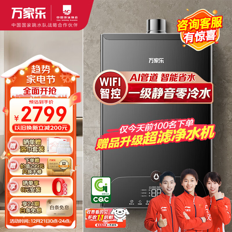 万家乐18升家用燃气热水器天然气一级静音恒温增压零冷水wifi智控防冻JSQ34-18RL10价格:2799.00元!
