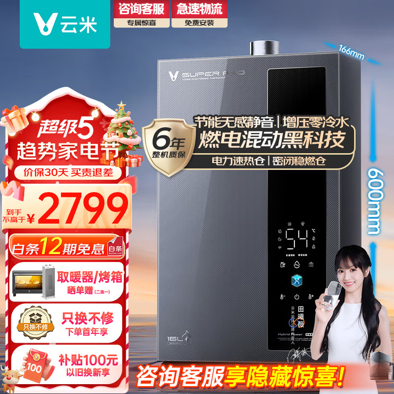 云米(VIOMI)燃气热水器家用16升恒温加热燃电混动增压零冷水Super pro 静音大水量强排天然气 稳燃舱多重防护价格:2799.00元!