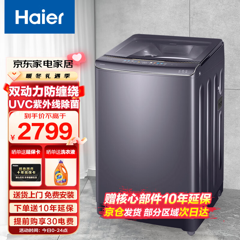 海尔(Haier)10KG新风双动力防缠绕波轮洗衣机全自动家用大容量直驱变频一级能效羽绒洗XQS100-BZ368T[家电]价格:2799.00元!