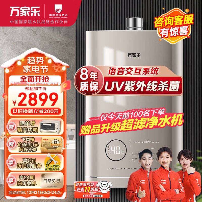 万家乐18升 燃气热水器四驱增压零冷水天然气语音无线分控AI智能节能紫外线杀菌阻垢净滤芯JSQ34-18RL11价格:2899.00元!