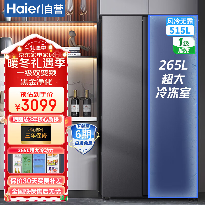 海尔(Haier)冰箱对开门515升双开门海尔冰箱 一级风冷无霜家用超薄大容量 冰箱黑金净化 BCD-515WLHSSEDS9价格:3099.00元!
