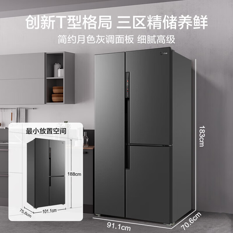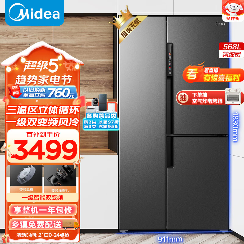 美的(Midea)慧鲜568升双变频一级能效T型门对开门双开门三开门多门家用智能电冰箱超薄大容量BCD-568WKPZM(E)价格:3499.00元!