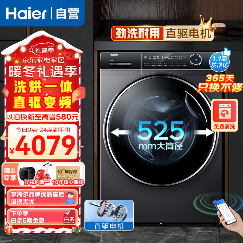 海尔(Haier)洗衣机10KG直驱变频全自动滚筒1.1洗净比洗烘一体香薰护衣纤薄机身525mm大筒径WIFI智能投放价格:4099.00元!