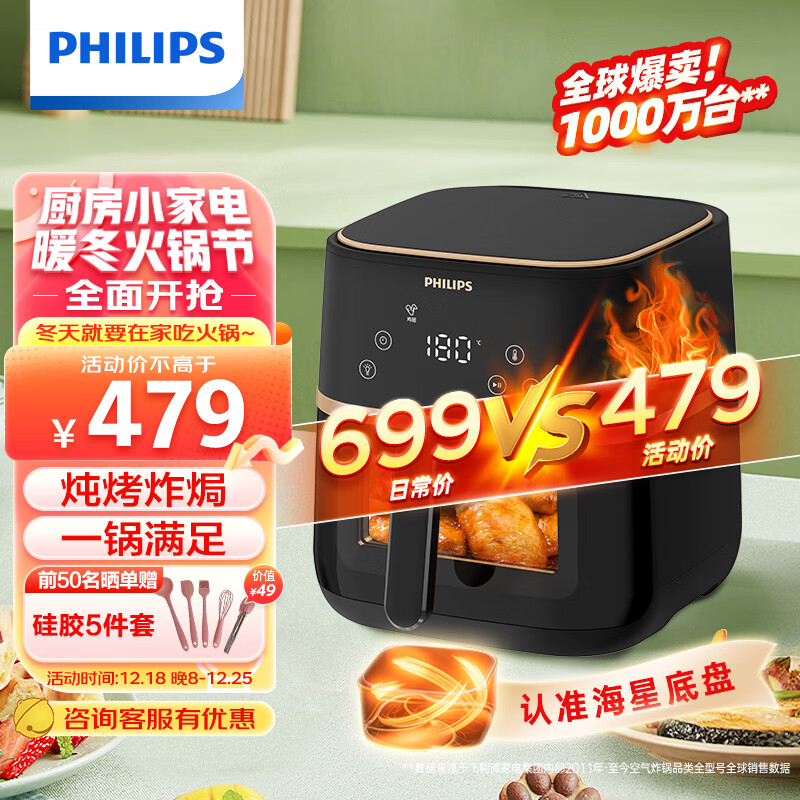 飞利浦(PHILIPS)空气炸锅家用5L大容量 可视 不用翻面 智能液晶触控 宽温域多功能电炸锅HD9455价格:519.00元!