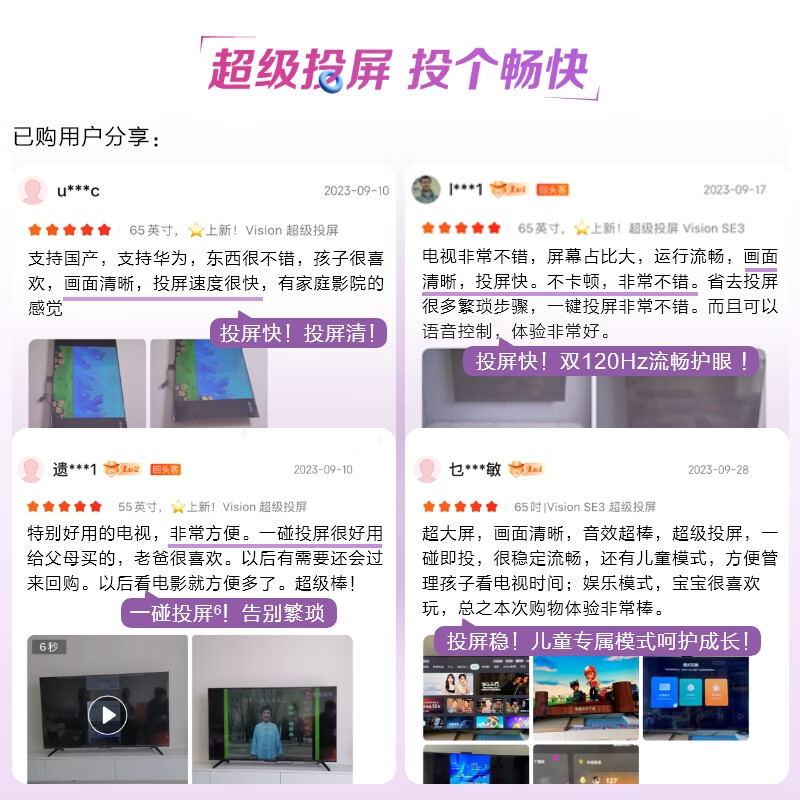 5、买华为品牌,质量很好,外观很漂亮,物流很快。同时自己也是华为mate50手机用户,互相投屏也非常方便。喜欢用小艺模式超控电视,非常满意!