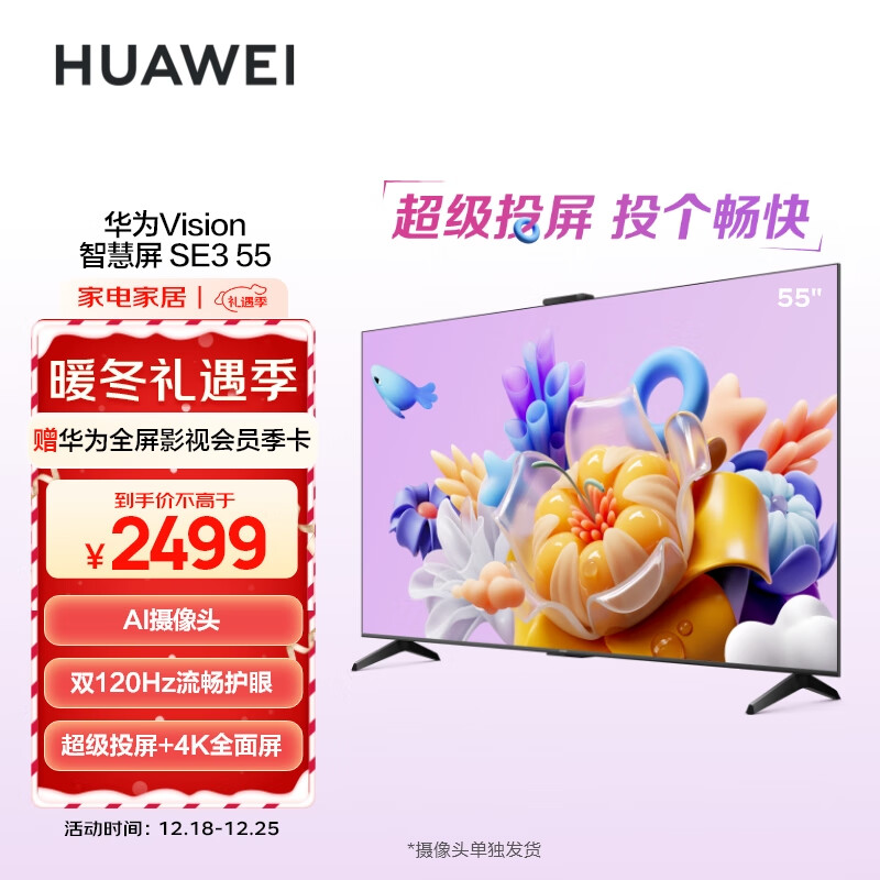 华为(HUAWEI)Vision智慧屏SE3 55英寸 Mate60超级投屏4K超高清 120Hz鸿鹄画质 AI摄像头智能电视机HD55KUNA价格:2499.00元!