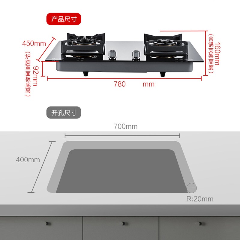 灶具开孔尺寸:690±20mm(灶台挖孔长度)