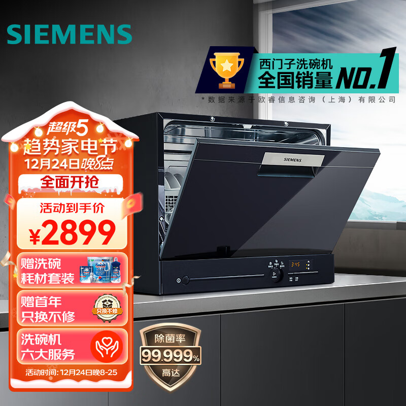 西门子全自动家用洗碗机嵌入式台式 易安装 高温除菌 加强烘干 原装进口 黑色5套 SK23E610TI价格:2899.00元!