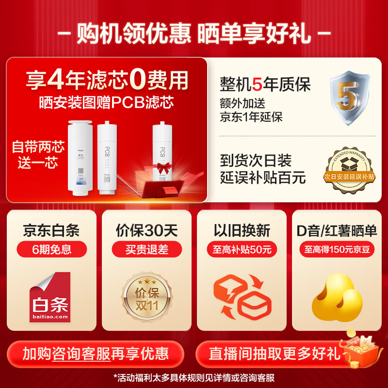 5、昨天买的今天就到了,上午到了,下大雨中午海尔的安装师傅就安好了,给一个大大的赞,看着很好,自测TDS值20,很棒