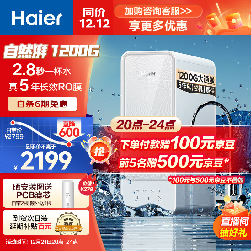 海尔(Haier)净水器家用净水机1200G大通量5年长效RO反渗透膜滤芯自清洗双出水厨下式过滤器 HRO12H99PRO-SU1价格:2199.00元!