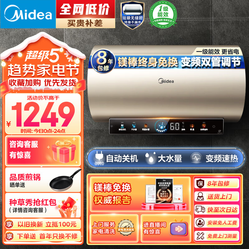 美的(Midea)终身免换镁棒60升电热水器家用储水式3300W/2300W速热变频省电一级能效低耗节能F6033-JE6(HE)价格:1449.00元!