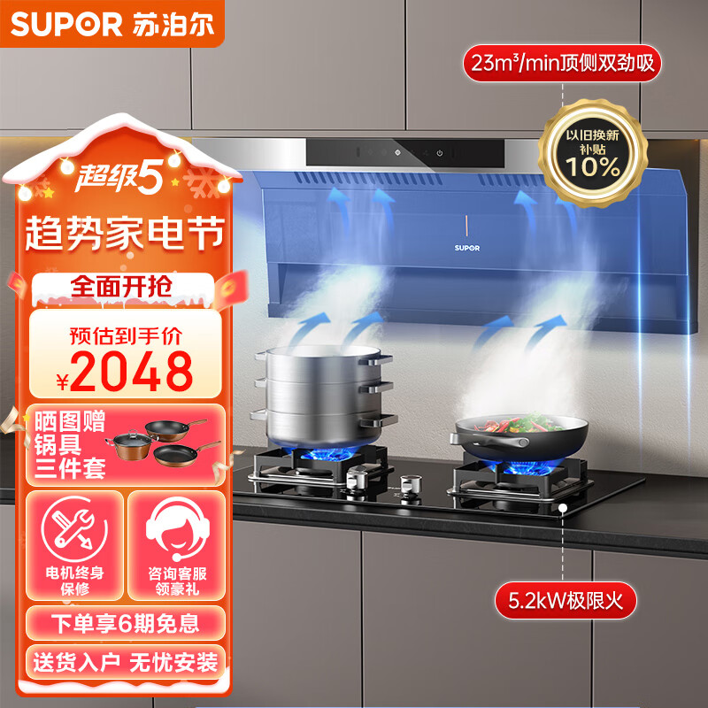 苏泊尔(SUPOR)抽油烟机 顶侧双吸7字型烟灶套装23立方挥手免拆洗家用烟机燃气灶具套装DL11+DB27液价格:2048.00元!