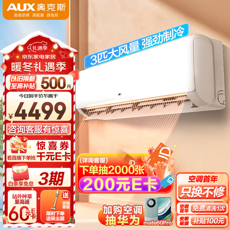 奥克斯(AUX) 空调3匹 三级能效 挂机 自清洁 冷暖两用 家用壁挂式 变频 (KFR-72GW/BpR3ZAQK(B3))价格:4499.00元!