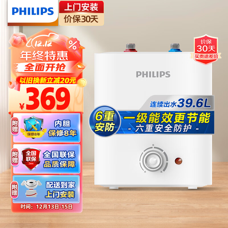 飞利浦(PHILIPS)一级能效6.6升上出水电热水器迷你小厨宝 小尺寸1600W速热 实时控温AWH1003/93(066UA)价格:399.00元!