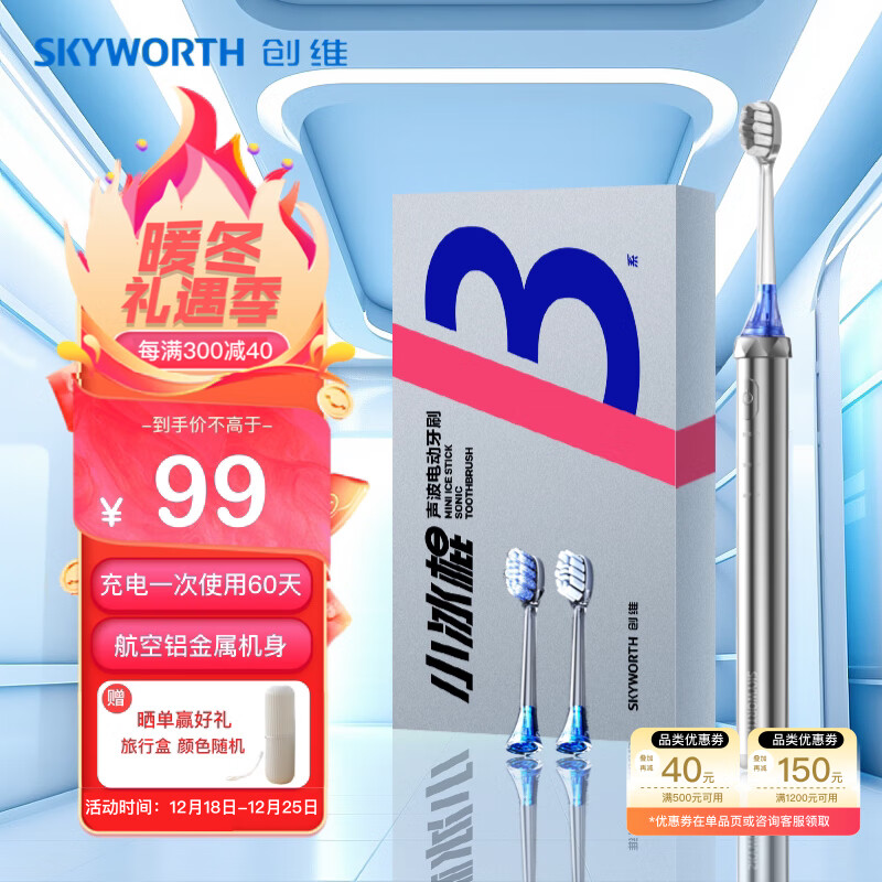 创维(Skyworth)小冰棍电动牙刷 成人超声波电动牙刷 情侣款送男友/送女友 冰川银 BG31价格:99.00元!