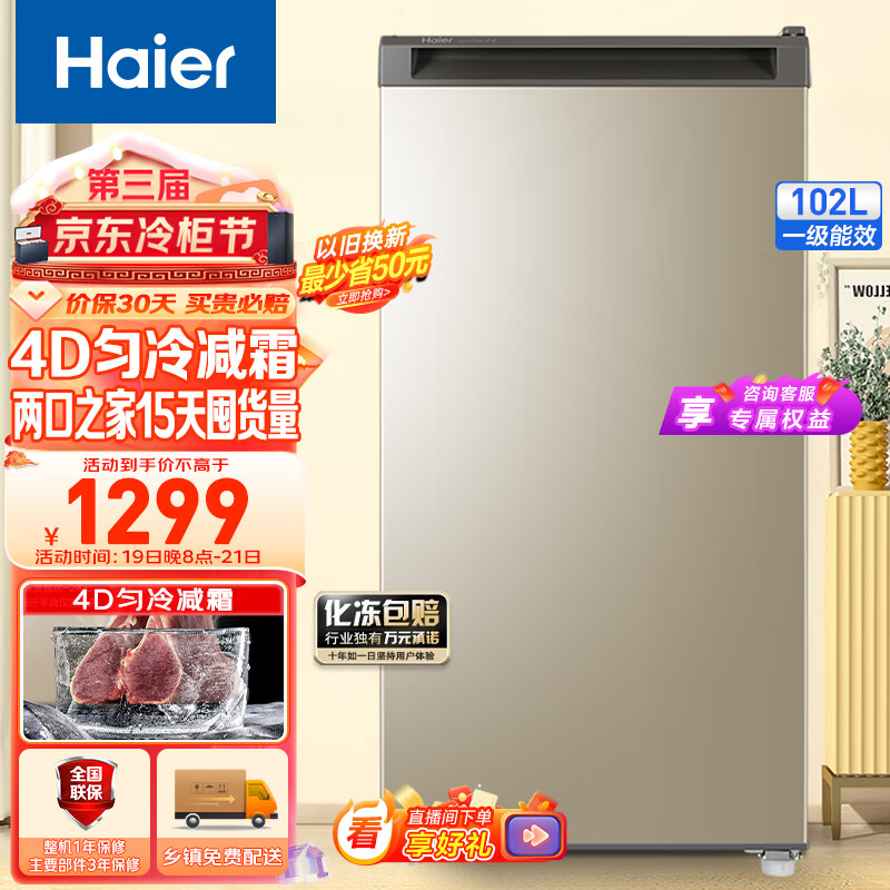 海尔(Haier)102升匀冷家用立式冰柜 母乳冷冻柜抽屉式冷柜囤货小冰柜家用小型冰箱BD-102MDT 以旧换新价格:1199.00元!