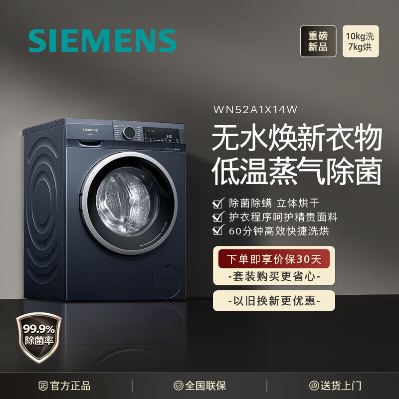 西门子(SIEMENS)10公斤滚筒洗衣机全自动 除菌洗烘一体机 智能烘干 热风清新 均匀烘干 湖蕴蓝 X14W价格:5099.00元!