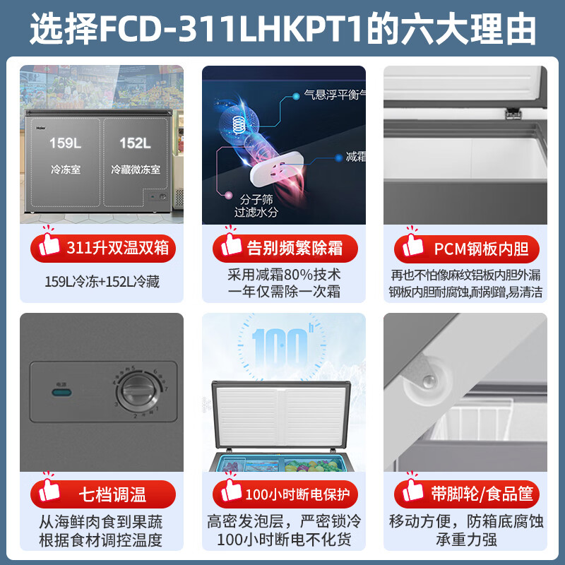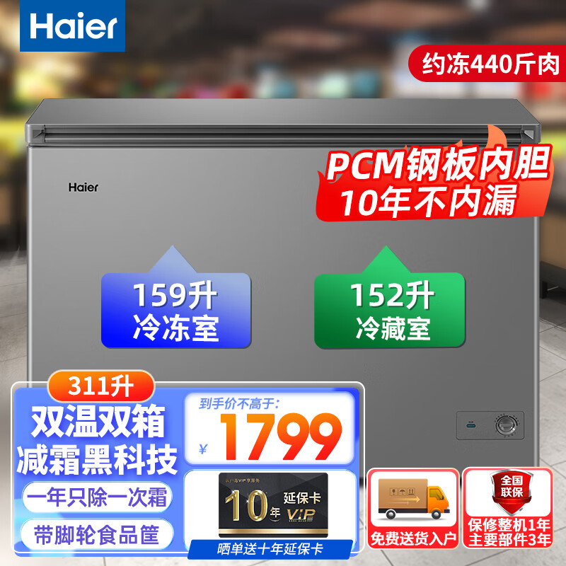 海尔(Haier)冰柜双温家用商用311升减霜80%冷藏冷冻节能两用冷柜 FCD-311LHKPT1价格:1799.00元!