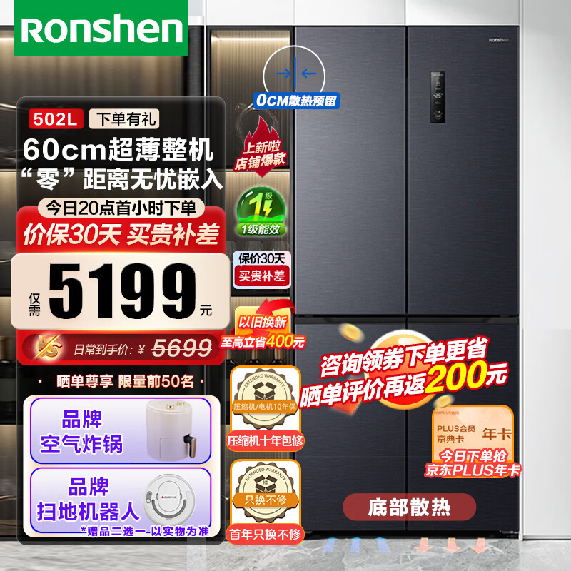 容声(Ronshen)【60cm平嵌系列】502升十字四开门双开冰箱 一级变频超薄“零”嵌入底部散热 BCD-502WD1FPQ星空灰价格:6299.00元!