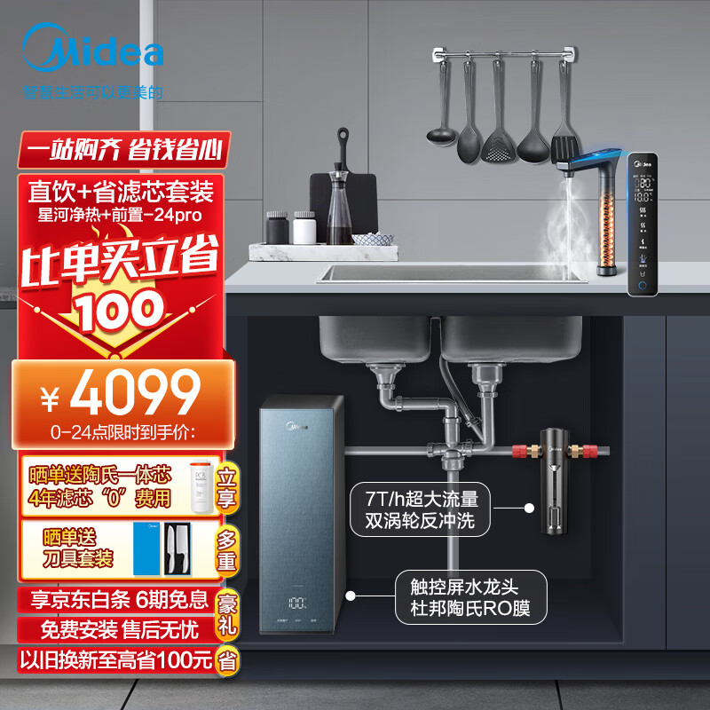 美的(Midea)省芯直饮套装【星河加热净水器+前置过滤器-24pro】厨下式智能水龙头 RO反渗透家用即热一体净饮机价格:4099.00元!