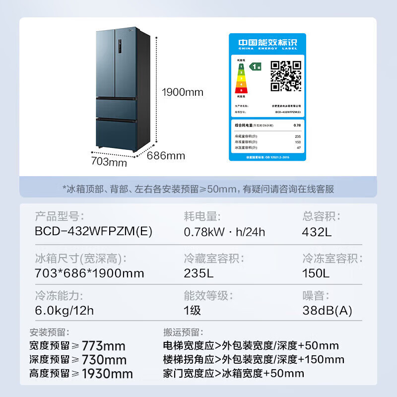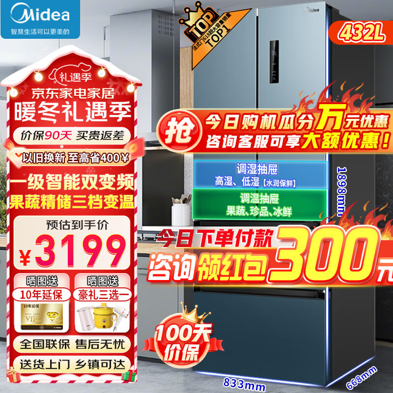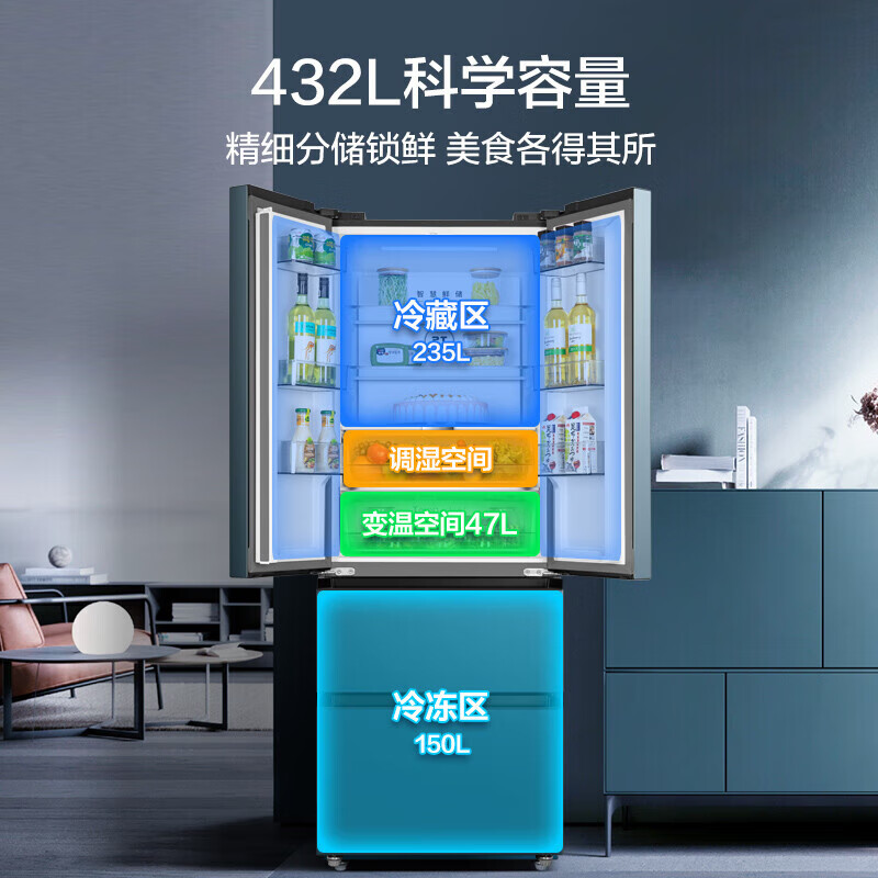 美的(Midea)【果润精储】432升法式多门四开门电冰箱家用一级能效双变频智能温湿精控BCD-432WFPZM(E)价格:3499.00元!