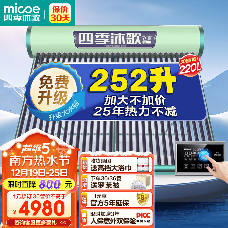 四季沐歌(MICOE)飞享太阳能热水器家用光电两用自动上水 预约电加热 水温水位显示 一级能效 送+装 30管220L价格:5780.00元!