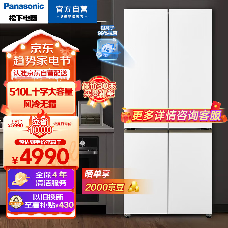 松下(Panasonic)510升十字对开门冰箱四开门 APP智控 银离子kang菌 风冷无霜 暖光白色NR-ED51CTA-W价格:4990.00元!